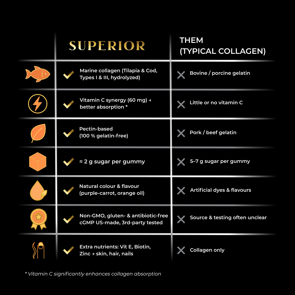 • Vitamin C Synergy – 60 mg of pure ascorbic acid amplifies collagen absorption and supports daily immune defence.